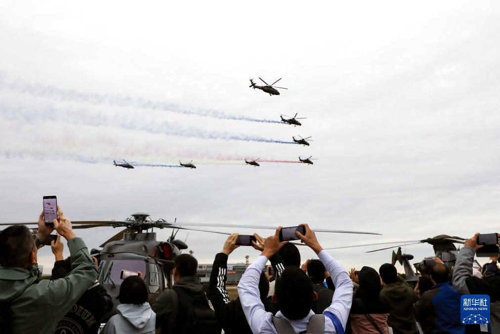 第七届中国天津国际直升机博览会16日至19日在天津举行。陆军“风雷”飞行表演队直-10、直-20、直-20T等3型11架直升机每天进行特技飞行表演,为观众献上一场场视觉盛宴。