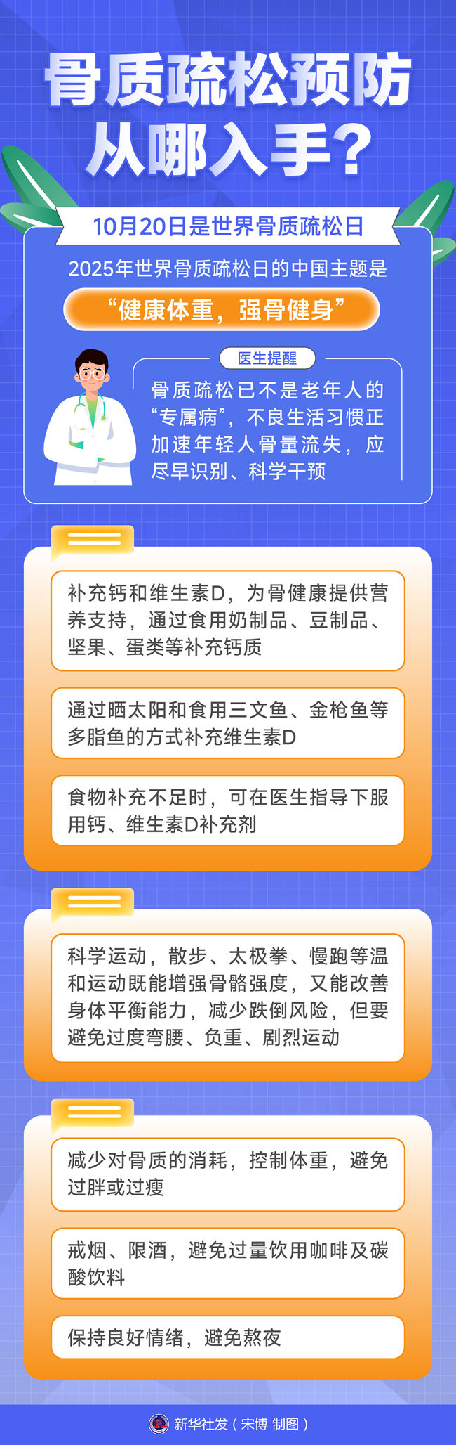 10月20日是世界骨质疏松日。2025年世界骨质疏松日的中国主题是“健康体重,强骨健身”。医生提醒,骨质疏松已不是老年人的“专属病”,不良生活习惯正加速年轻人骨量流失,应尽早识别、科学干预。