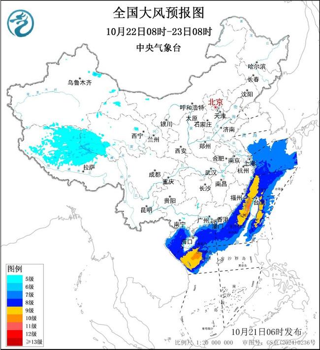 预计,10月21日08时至22日08时,新疆北部和东部、西藏中北部、青海西南部、甘肃西部、浙江东部、广东南部、广西南部、海南岛等地部分地区有5~6级风,阵风7~8级;黄海南部海域、东海北部海域将有7~8级、阵风9~10级的大风,东海南部海域、台湾海峡、台湾以东洋面、南海北部和中西部海域、琼州海峡、北部湾将有7~9级、阵风10~11级的大风,其中东海西南部、台湾海峡、南海西北部和中西部的部分海域风力可达10~11级、阵风12~13级。