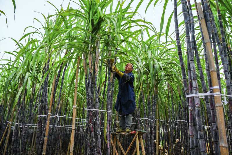 在广西兴业县大平山镇三联村一处甘蔗种植基地内,村民在打理甘蔗叶子(资料照片)。曹祎铭摄/本刊