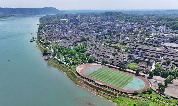傍晚,我来到四川省宜宾市李庄古镇的月亮田。夜色中,长江逐渐变成一条墨色绸带,岸边灯火星星点点,江风拂面。今年正值中国人民抗日战争暨世界反法西斯战争胜利80周年,这座以文化抗战闻名的小镇格外热闹,从清晨到夜晚,游人络绎不绝。