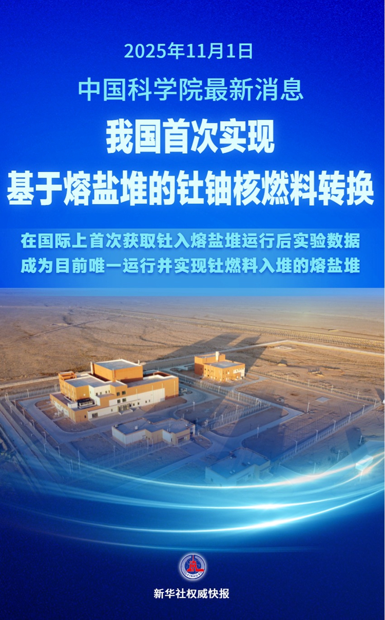 记者11月1日从中国科学院获悉,由中国科学院上海应用物理研究所牵头建成的2兆瓦液态燃料钍基熔盐实验堆,首次实现钍铀核燃料转换,在国际上首次获取钍入熔盐堆运行后实验数据,成为目前唯一运行并实现钍燃料入堆的熔盐堆,初步证明了熔盐堆核能系统利用钍资源的技术可行性,进一步巩固了我国在国际熔盐堆研究领域的引领地位。