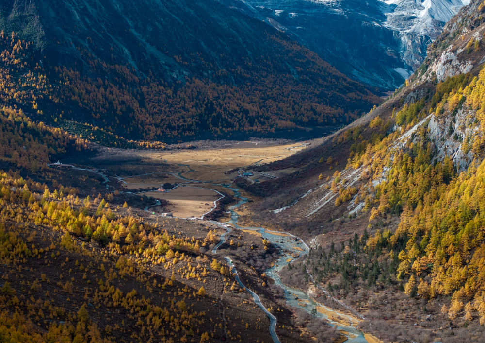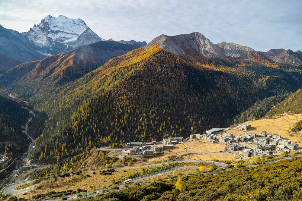 ↑ 俯瞰雪山下的亚丁村(10月30日摄)。新华社发(庄歌尔摄)