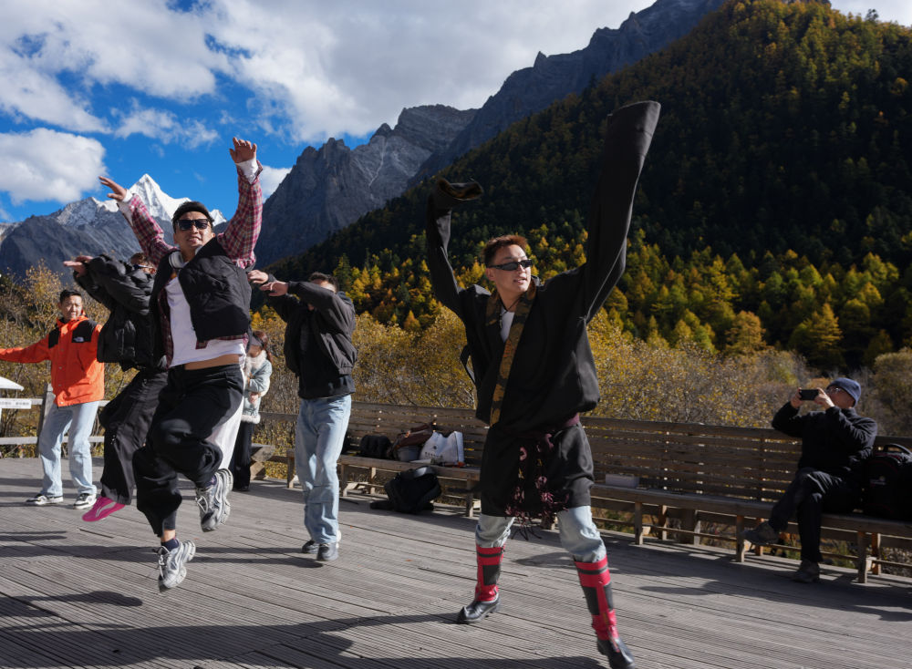 ↑ 几位藏族小伙子和游客一起在冲古寺草甸前跳锅庄(10月26日摄)。新华社记者 江宏景 摄
