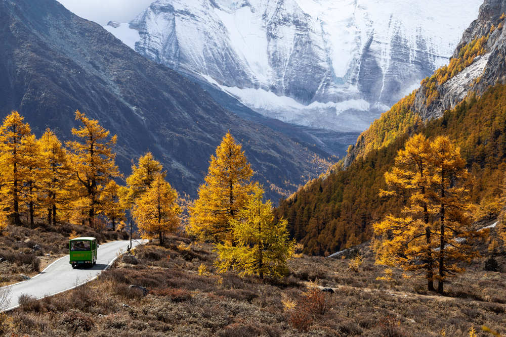 ↑ 在稻城亚丁景区,一辆摆渡车载着游客行驶在景区公路上(10月29日摄)。新华社记者 江宏景 摄