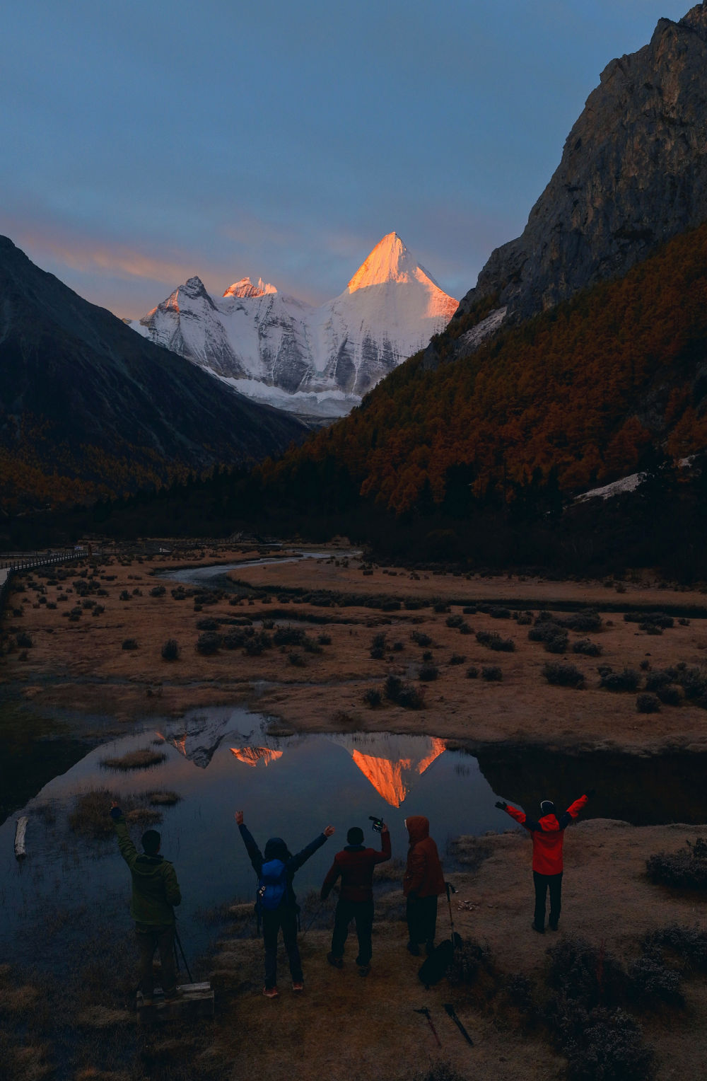 ↑ 日出时分,央迈勇雪山倒映在水中(10月30日摄)。新华社发(兰红光摄)