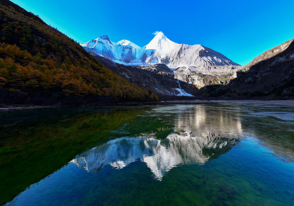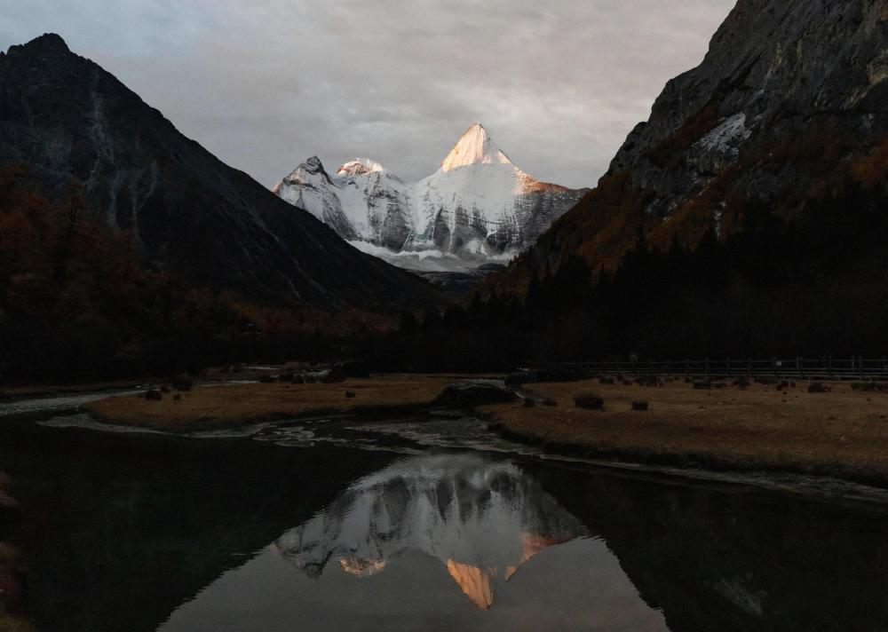 ↑ 日出时分,央迈勇雪山倒映在水中(10月30日摄)。新华社记者 江宏景 摄