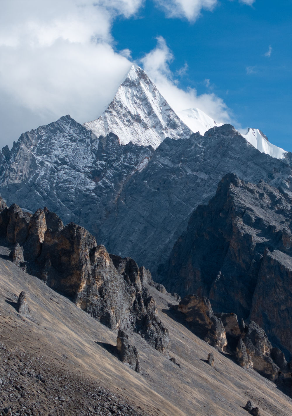 ↑ 夏诺多吉雪山下的角峰冰川地貌(10月28日摄,无人机照片)。新华社记者 江宏景 摄