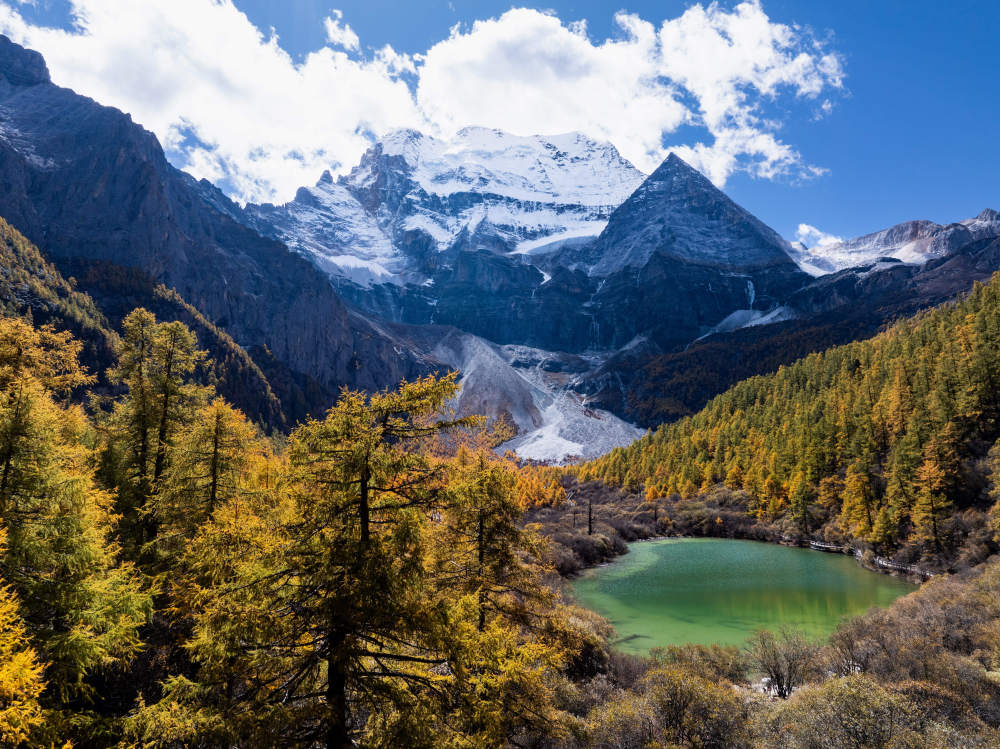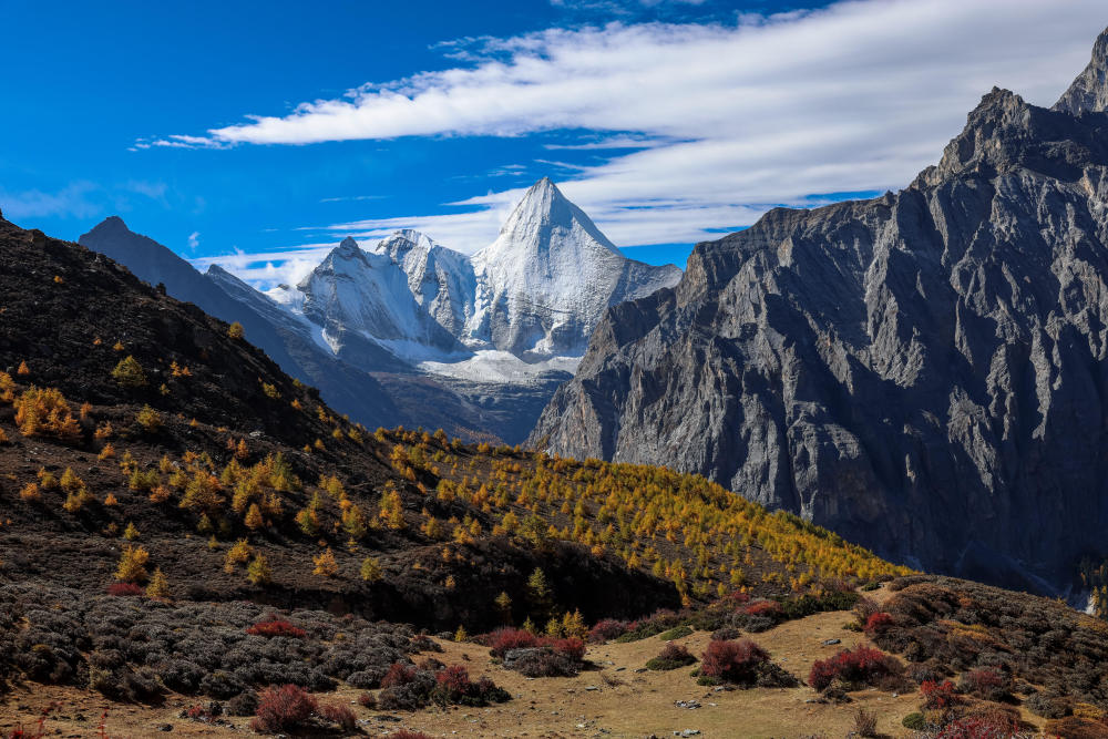 ↑ 在稻城亚丁景区,蓝天、白云、雪山与彩林相互映衬(10月28日摄)。新华社记者 江宏景 摄