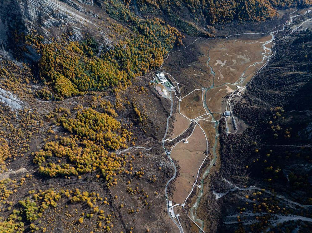 ↑ 俯瞰稻城亚丁景区洛绒牛场(10月29日摄,无人机照片)。新华社记者 江宏景 摄