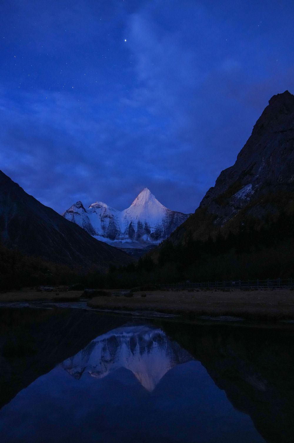 ↑ 日落时分,夏诺多吉雪山倒映在水中(10月26日摄)新华社记者 江宏景 摄