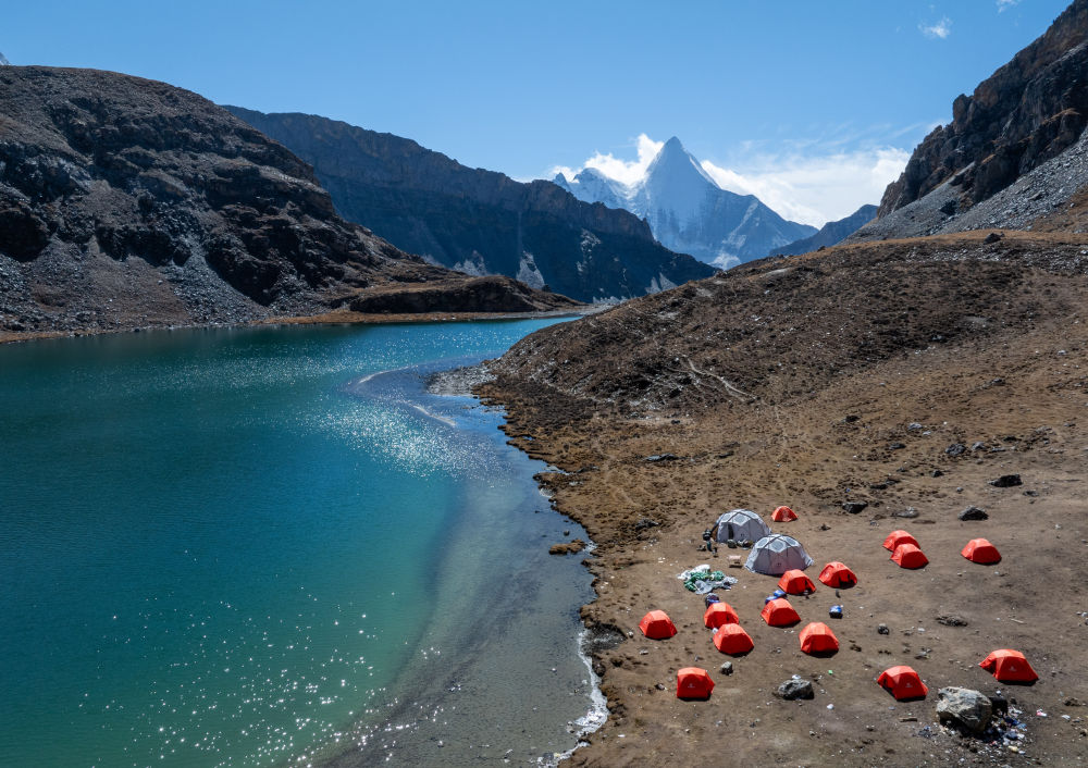 ↑ 在稻城亚丁景区波拥措,湖边搭着徒步爱好者的帐篷(10月28日摄,无人机照片)。新华社记者 江宏景 摄