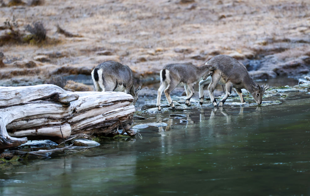 ↑ 在稻城亚丁景区贡嘎措,一群岩羊在喝水(10月27日摄)。新华社记者 江宏景 摄