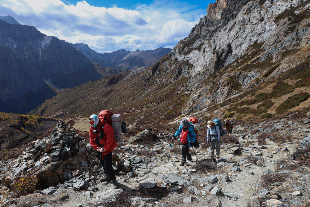 ↑ 在稻城亚丁景区,徒步爱好者前往波拥措(10月28日摄)。新华社记者 江宏景 摄