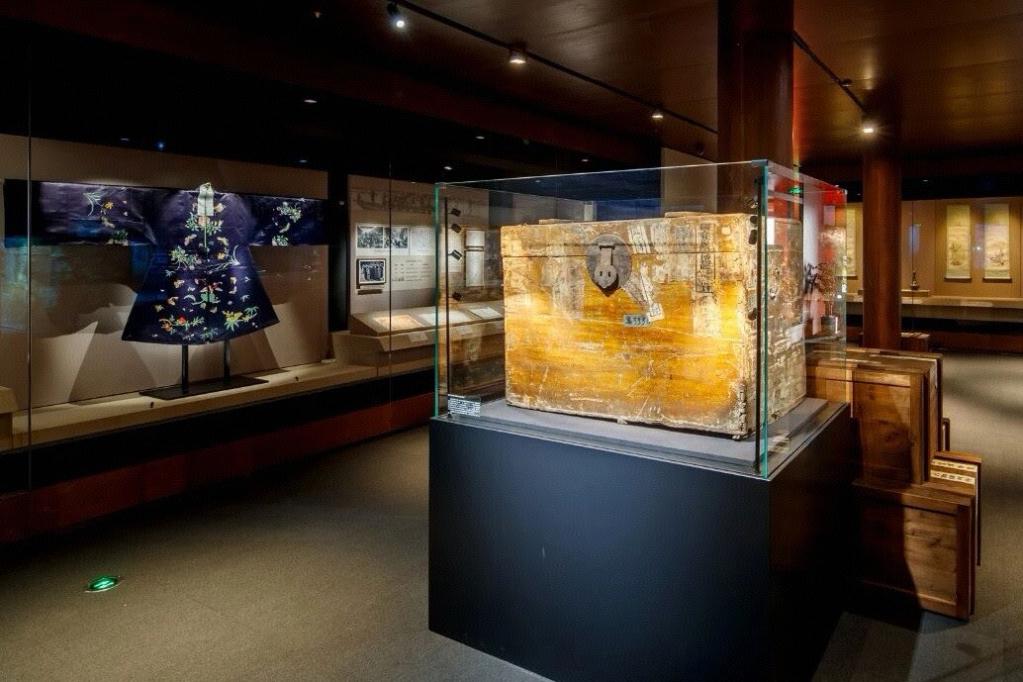 展厅中央,一件斑痕累累、上有不同封条印迹的大木箱吸引观众注意。根据档案记载,箱子内当时装有284件戏衣等物,随文物迁徙南下北上。当时装于箱内的一件清康熙石青色折枝花蝶纹妆花缎女帔同步展出。