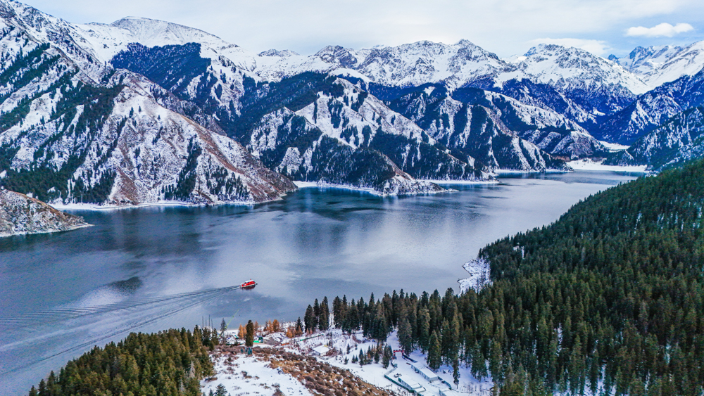 ↑2025年11月14日,游客乘船在新疆昌吉回族自治州阜康市天山天池景区游览。(无人机照片)CICPHOTO/陶维明 摄
