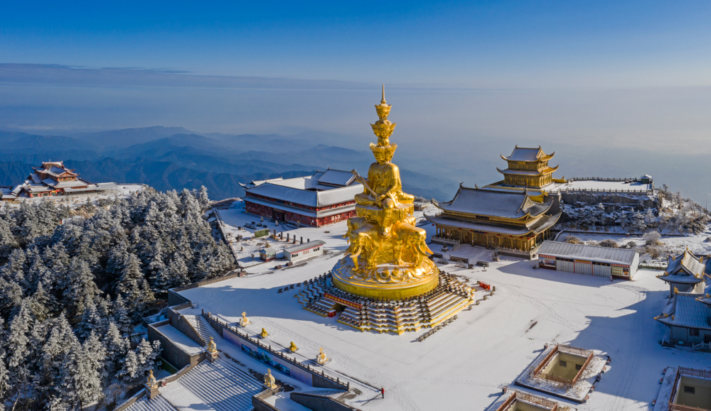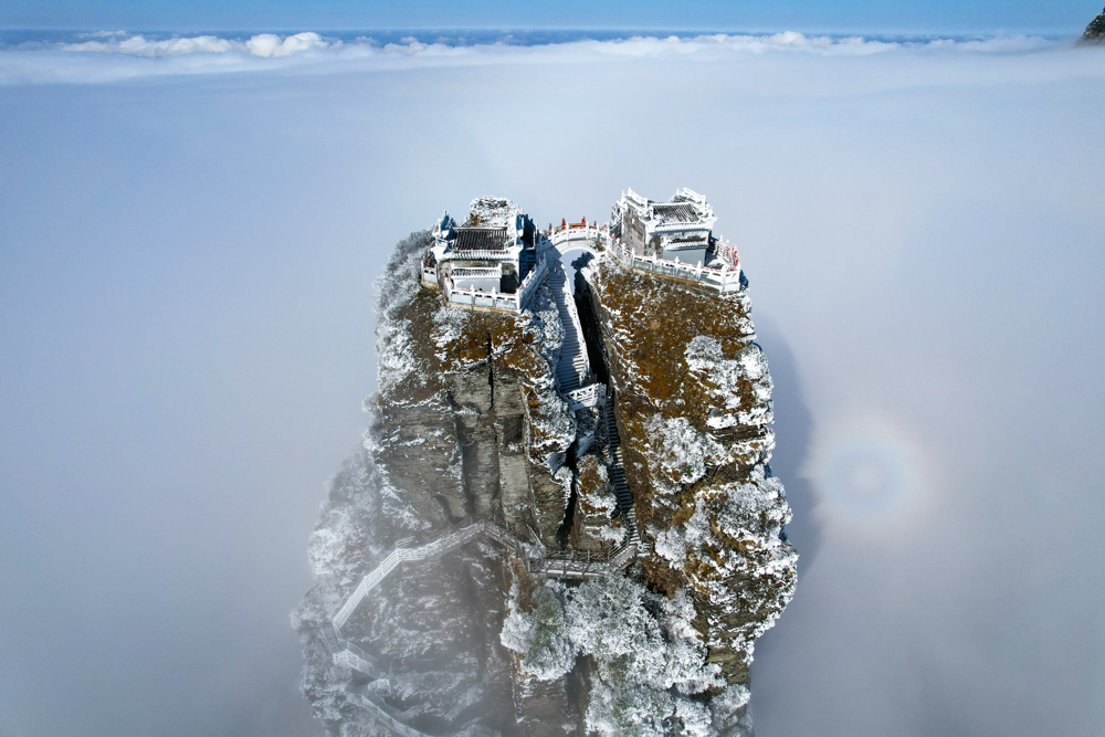 ↑2020年12月6日在四川省乐山市峨眉山金顶拍摄的雪景。(无人机照片)CICPHOTO/孔胜 摄