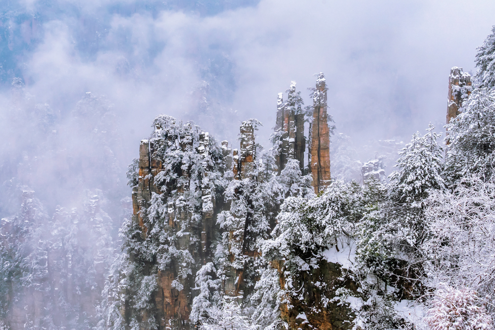 ↑2021年12月26日在湖南省张家界市武陵源国家森林公园拍摄的雪景。(无人机照片)CICPHOTO/田其珍 摄