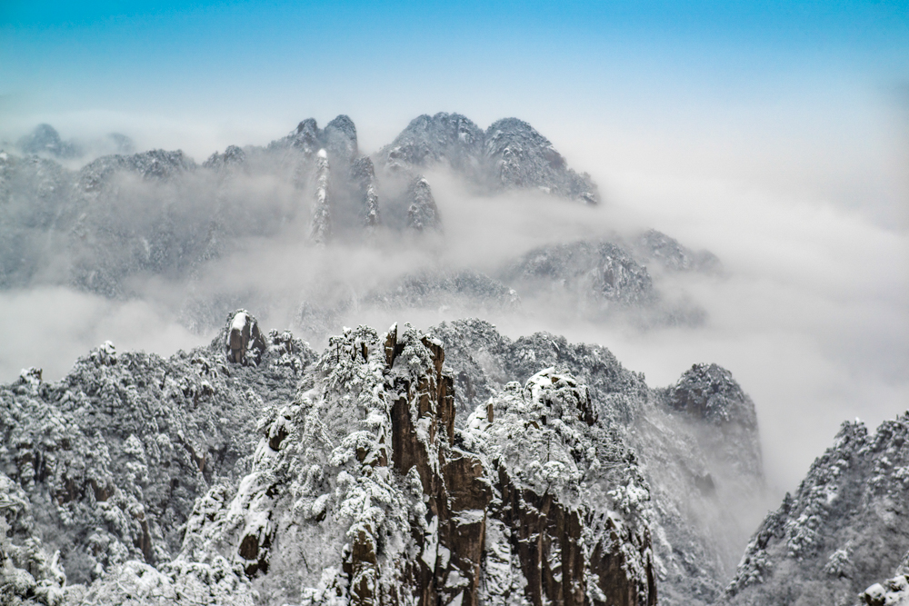↑2022年1月29日在安徽省黄山风景区拍摄的雪景。(无人机照片)CICPHOTO/水从泽 摄