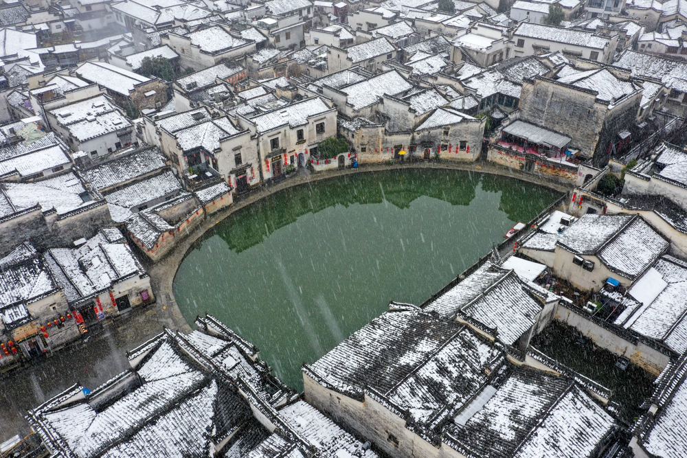 ↑2022年1月29日在安徽省黄山市黟县宏村拍摄的雪景。(无人机照片)CICPHOTO/施亚磊 摄