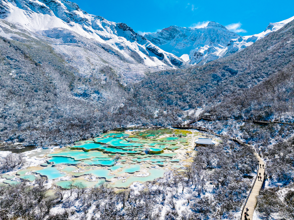 ↑2024年11月4日在四川省阿坝藏族羌族自治州松潘县黄龙风景名胜区拍摄的雪景。(无人机照片)CICPHOTO/周乐鹏 摄
