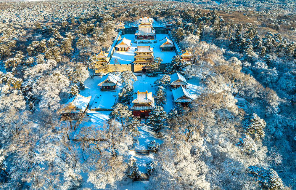 ↑2022年3月1日在沈阳东陵公园拍摄的清福陵雪景。(无人机照片)CICPHOTO/姜守凯 摄