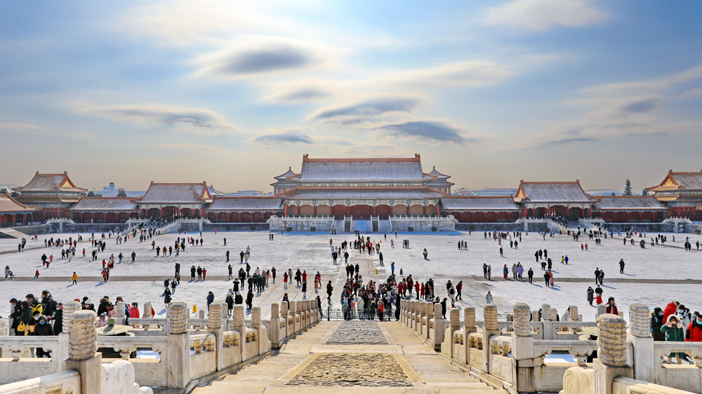 ↑2022年2月15日,游客在北京故宫博物院赏雪游玩。CICPHOTO/刘宪国 摄