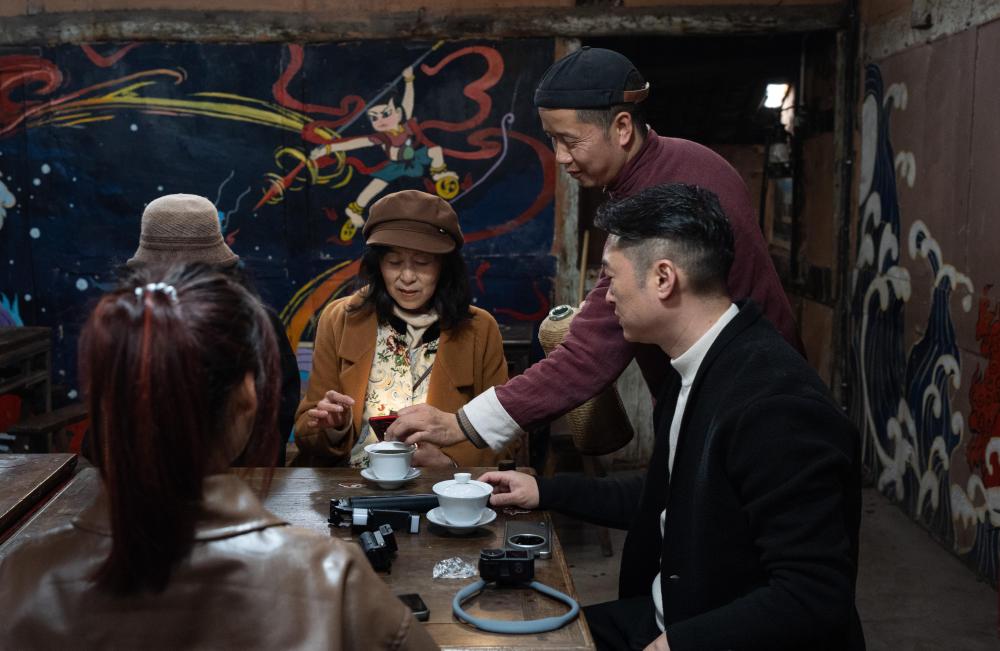 2025年3月2日,在四川省宜宾市泥溪镇坤隆昌茶馆,姚元全(右二)给顾客添茶倒水。该茶馆内,有一幅长达数米以《封神演义》为蓝本绘制的哪吒主题壁画。随着电影《哪吒之魔童闹海》火爆,这座茶馆成了热门打卡点。