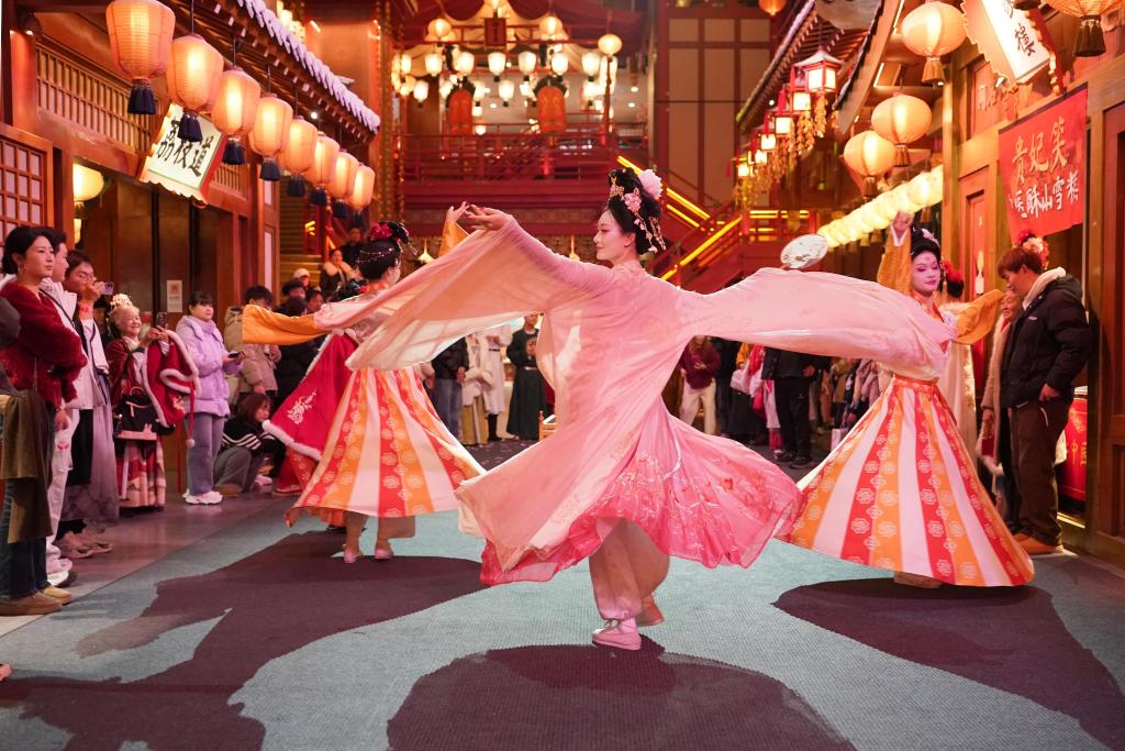 2025年12月23日,演员在西安的长安十二时辰主题街区内进行沉浸式表演《花魁巡游》。