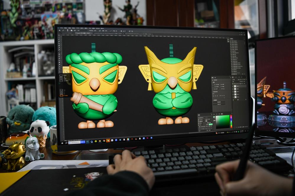 2025年3月1日,文创产品策划运营师曾舟在成都的办公室完善细化三星堆青铜神树文创产品细节。