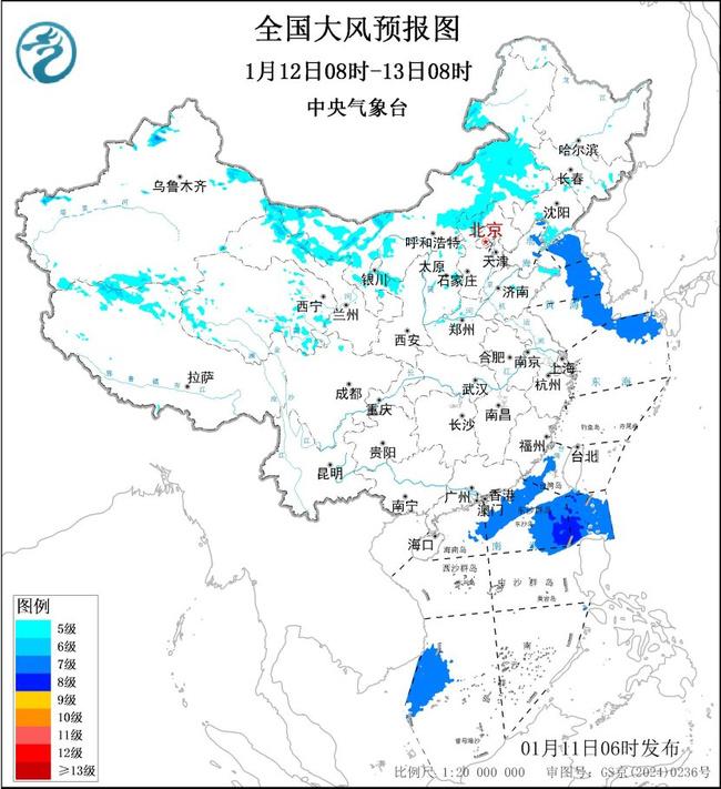 1月12日08时至13日08时,内蒙古中西部、甘肃西部、宁夏北部、华北北部、山东半岛、辽东半岛等地部分地区有5~6级大风、阵风7~9级;渤海、渤海海峡、黄海大部海域、东海北部海域、台湾海峡、巴士海峡、南海北部和西南部海域将有7~8级、阵风9级的风。