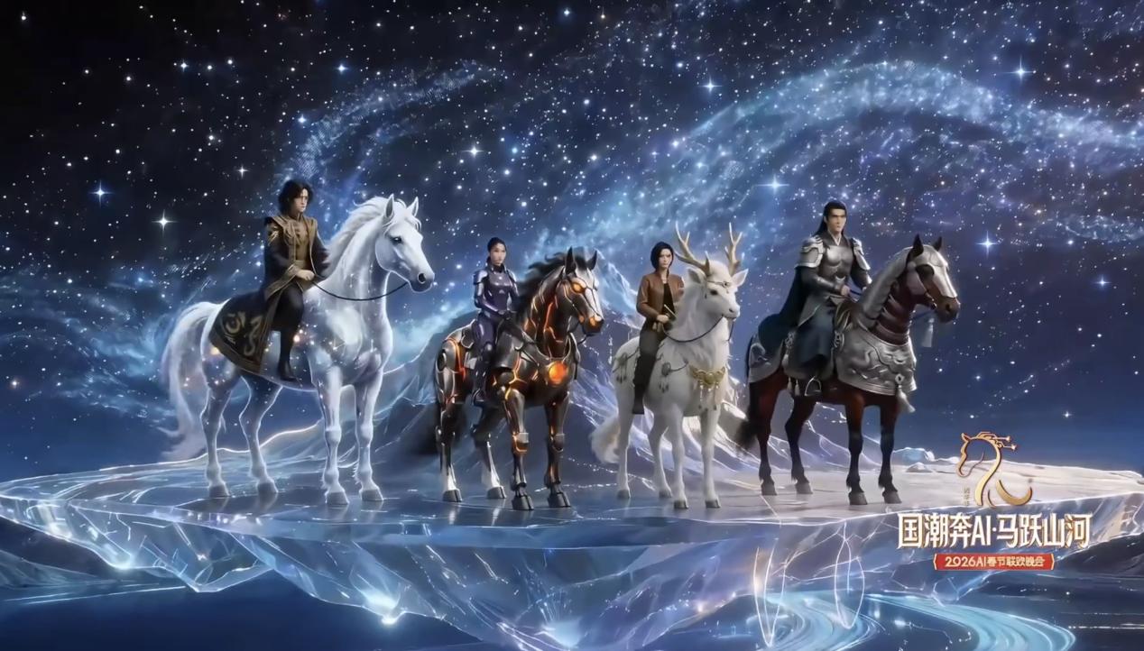 《国潮奔AI・马跃山河——2026AI春节联欢晚会》是尝试全民共创的全AI文艺晚会,践行了新大众文艺“开门办春晚”的宗旨,以精品视听引领大众的创作热情,以AI技术探索中国传统文化与数字艺术相映成辉的视听创作新路径。