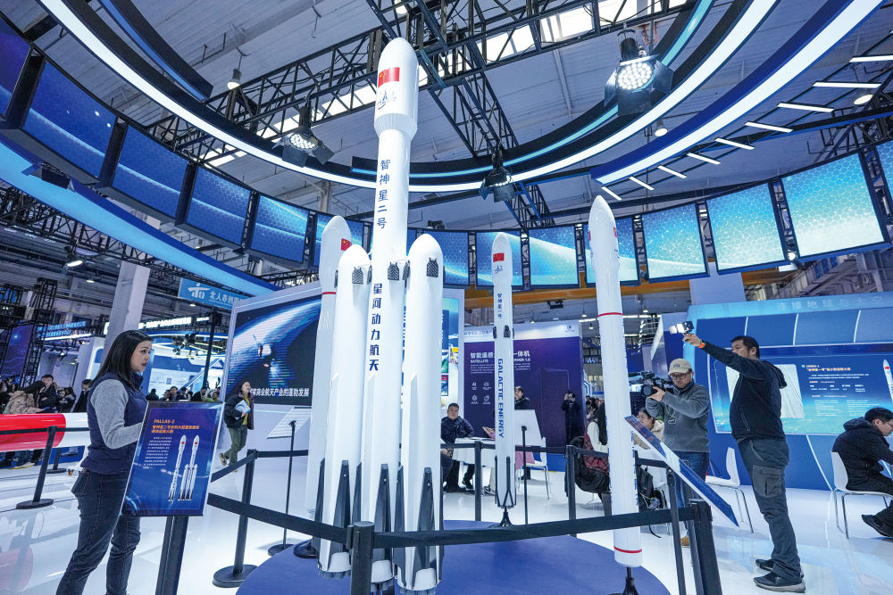 观众在2026北京国际商业航天展的星河动力航天展台参观展出的火箭模型。新华社记者鞠焕宗摄