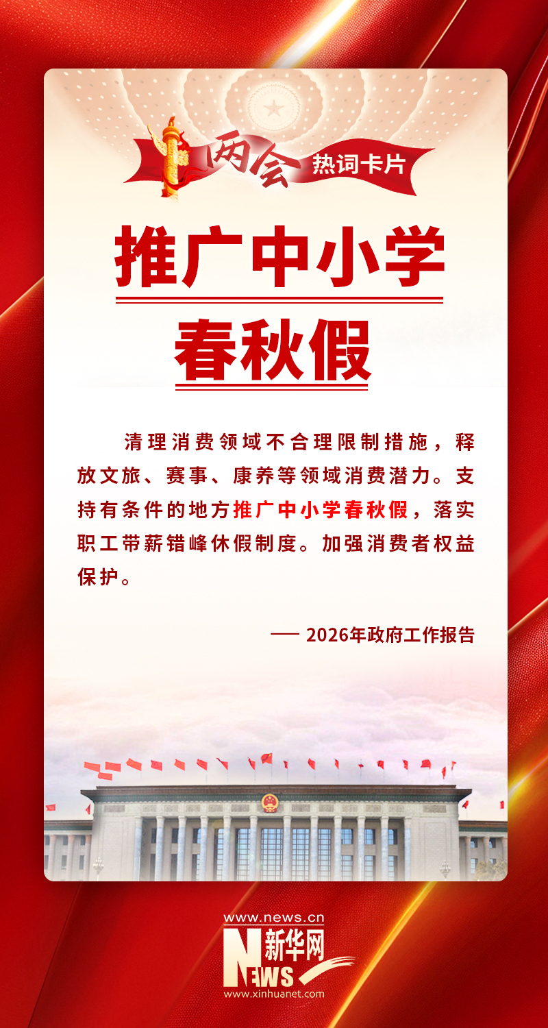 优化学生假期安排,完善配套政策。在放假总天数和教学时间总量保持不变的情况下,鼓励有条件的地方结合气候条件、生产安排、职工带薪休假制度落实等因素,科学调整每学年的教学和放假时间,探索设置中小学春秋假,相应缩短寒暑假时间,增加旅游出行等服务消费时间。(商务部等9部门印发《关于扩大服务消费的若干政策措施》的通知 2025年9月5日)