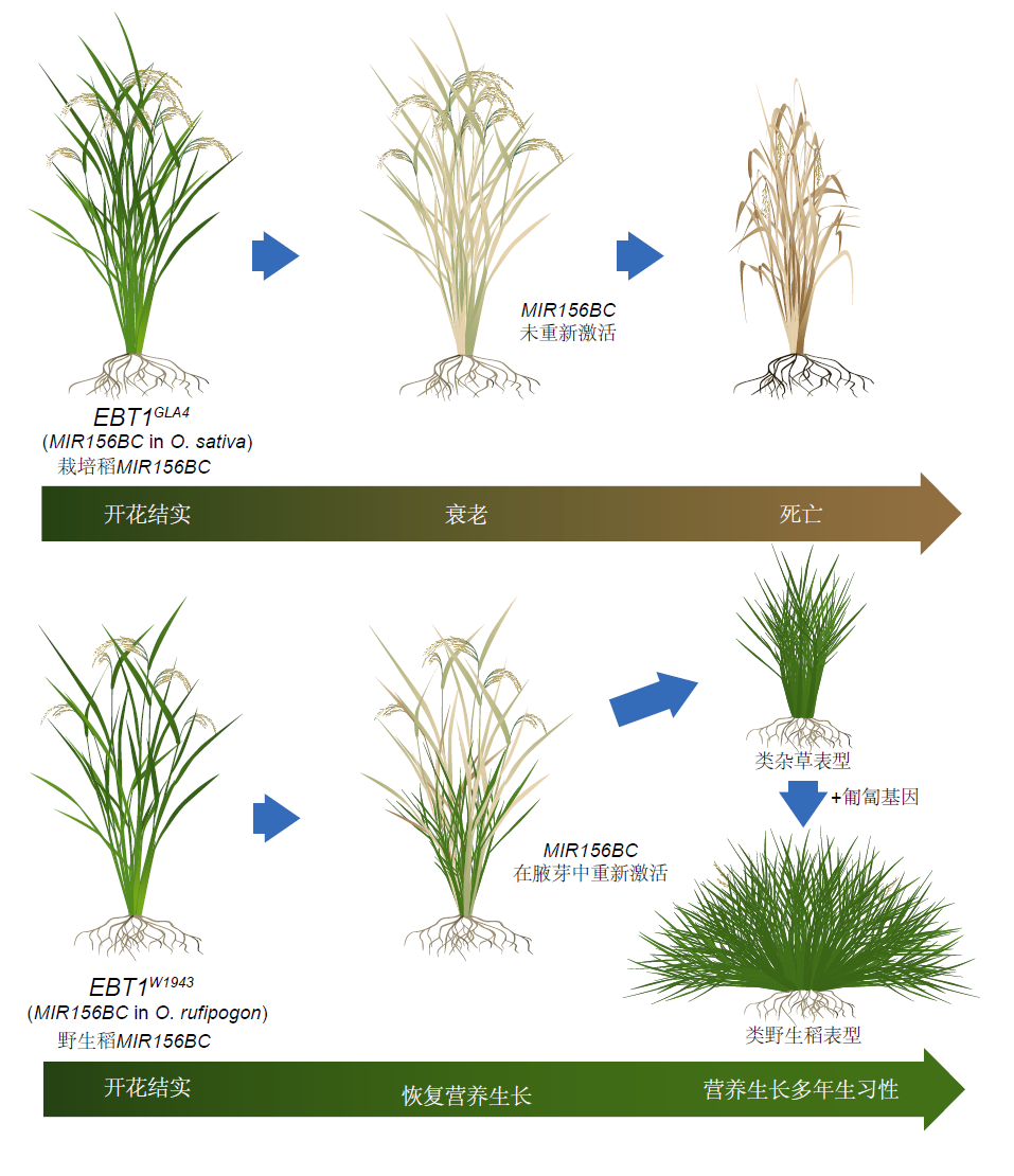 MIR156BC的重置介导了水稻从一年生向多年生的转变示意图(中国科学院分子植物科学卓越创新中心供图)