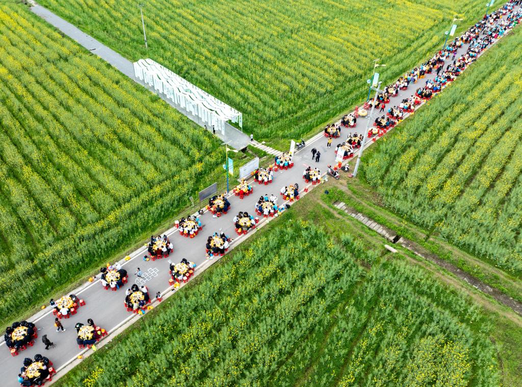 3月21日,游客在四川省广安市广安区花桥镇油菜花田间吃坝坝席(无人机照片)。新华社发(张国盛 摄)