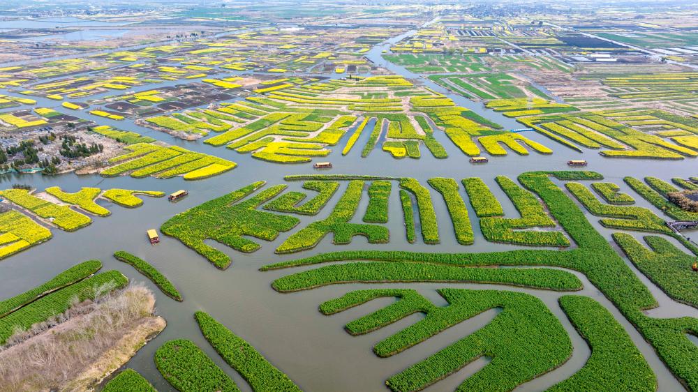 3月19日,游客乘船在江苏省兴化市千垛景区赏花游玩(无人机照片)。新华社发(顾继红 摄)