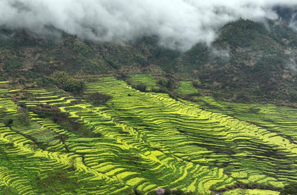 这是3月24日拍摄的江西省婺源县篁岭景区的油菜花梯田(无人机照片)。新华社记者 万象 摄