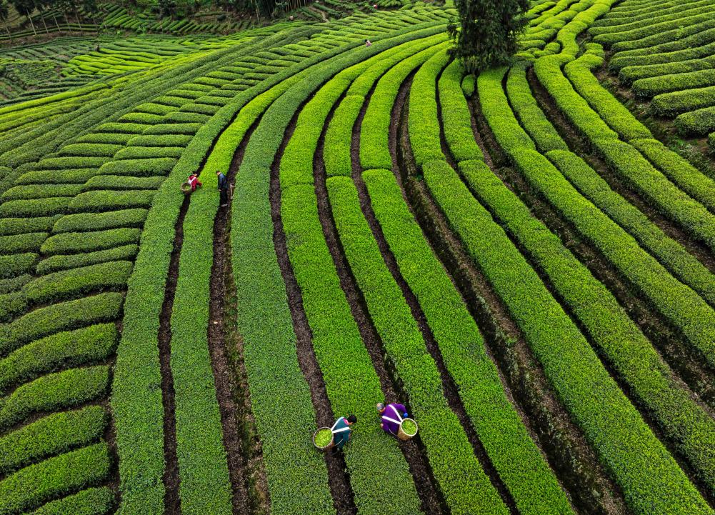 3月15日,四川省乐山市沐川县利店镇,茶农在茶园采摘春茶。新华社发(孔胜摄)