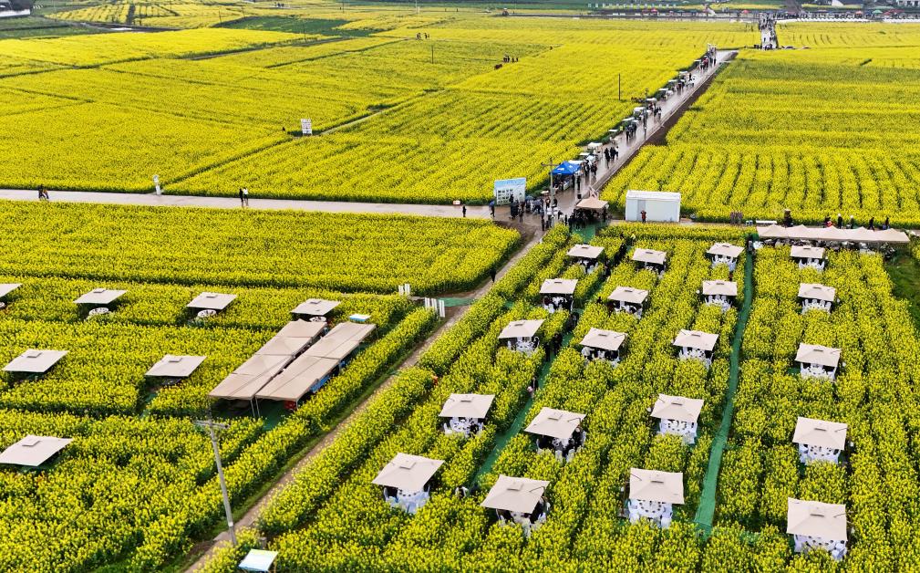 游客在四川省南充市蓬安县睦坝镇武胜村油菜花田里体验“花田席”(3月13日摄,无人机照片)。新华社发(刘永红摄)