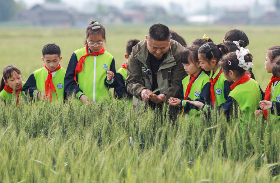 2026年4月1日,在四川省眉山市彭山区观音街道兴崇社区千亩粮油基地,农业技术人员在田间为鹏利小学学生科普小麦播种技术、生长周期及现代农业科技应用等知识。新华社发(翁光建摄)