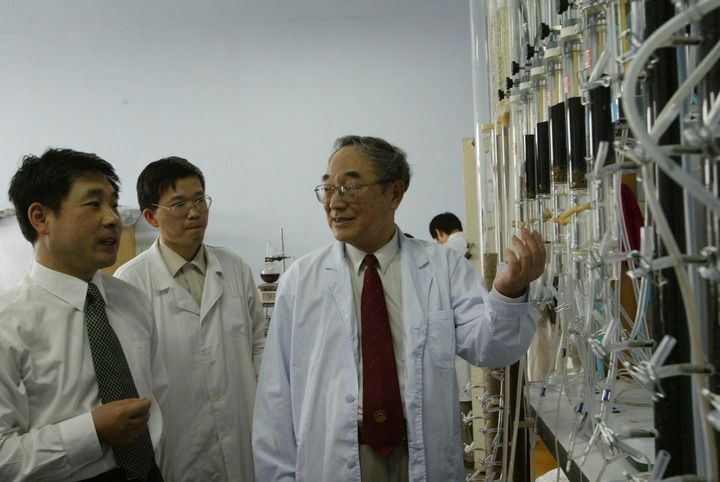 马军院士(左)和导师李圭白院士(右)在实验室进行研究(2003年5月22日摄)。哈尔滨工业大学党委宣传部供图