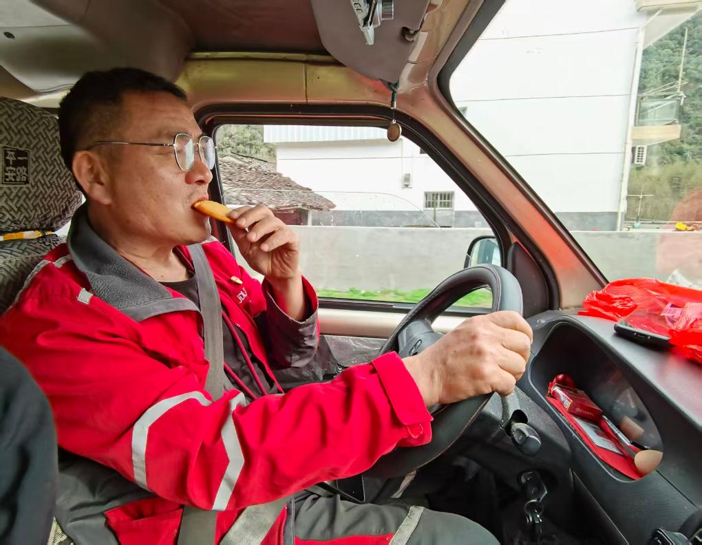 送山村快递路程远、耗时长,檀世旺常常为节省吃饭时间在路上吃些饼干。新华社记者 朱青 摄