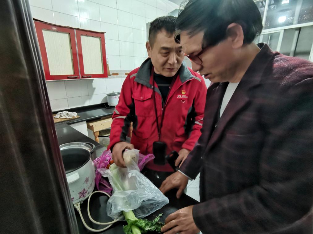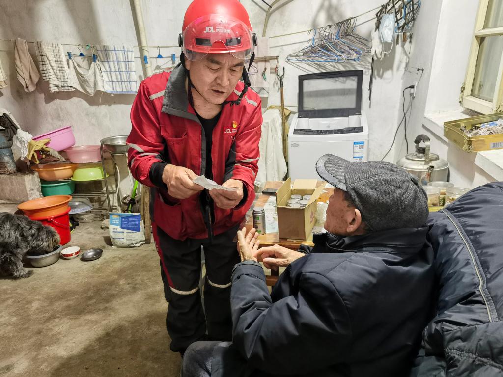 檀世旺在晚间为81岁的吴文华老人送去药品快递,为他讲解用药注意事项。新华社记者 朱青 摄