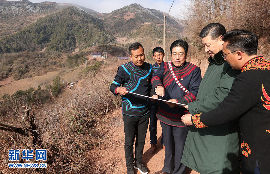 2月11日,中共中央总书记、国家主席、中央军委主席习近平在四川考察。这是习近平在凉山彝族自治州昭觉县三岔河乡三河村听取易地扶贫搬迁安置点规划情况介绍。新华社记者 鞠鹏 摄