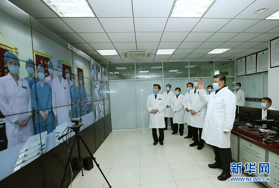 2月10日,中共中央总书记、国家主席、中央军委主席习近平在北京调研指导新冠肺炎疫情防控工作。这是习近平来到首都医科大学附属北京地坛医院门诊楼一层运行监控中心,通过监控画面察看患者住院诊疗情况,并视频连线正在病房值班的医务人员。 新华社记者 鞠鹏 摄