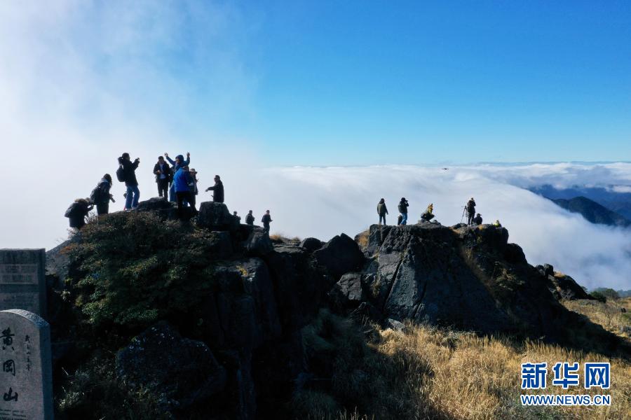 2020年12月1日,人们在云雾缭绕的武夷主峰黄岗山山顶眺望(无人机照片)。新华社记者 姜克红 摄