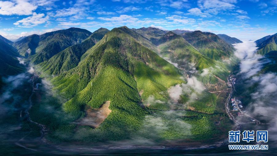 2020年12月1日,武夷断裂带峡谷内云雾缭绕,村庄若隐若现(无人机照片)。新华社记者 姜克红 摄