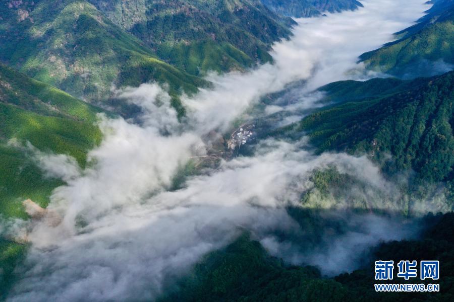 2020年12月1日,武夷断裂带峡谷内云雾缭绕,村庄若隐若现(无人机照片)。新华社记者 姜克红 摄