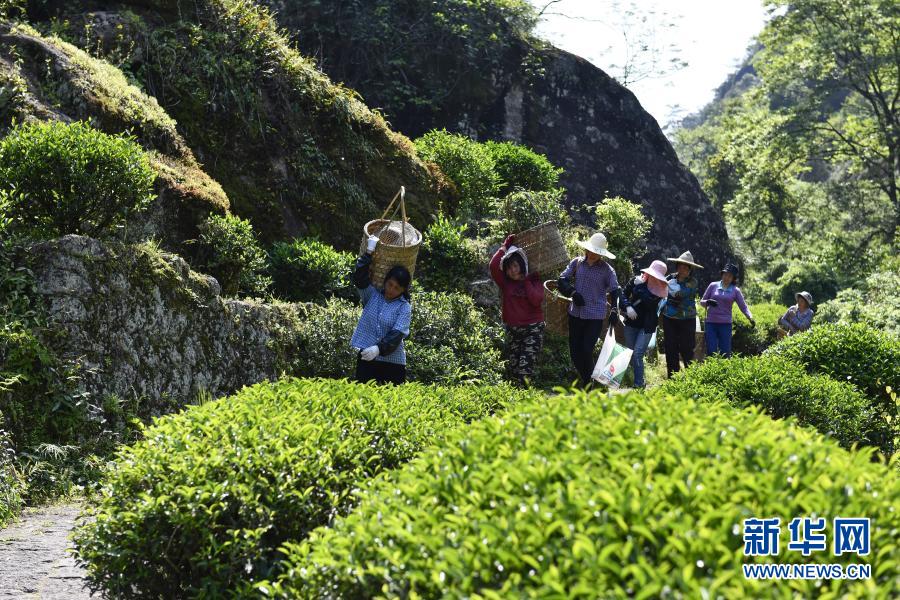 2020年4月29日,在福建省武夷山岩茶核心产区,工人采茶后返回。新华社记者 姜克红 摄